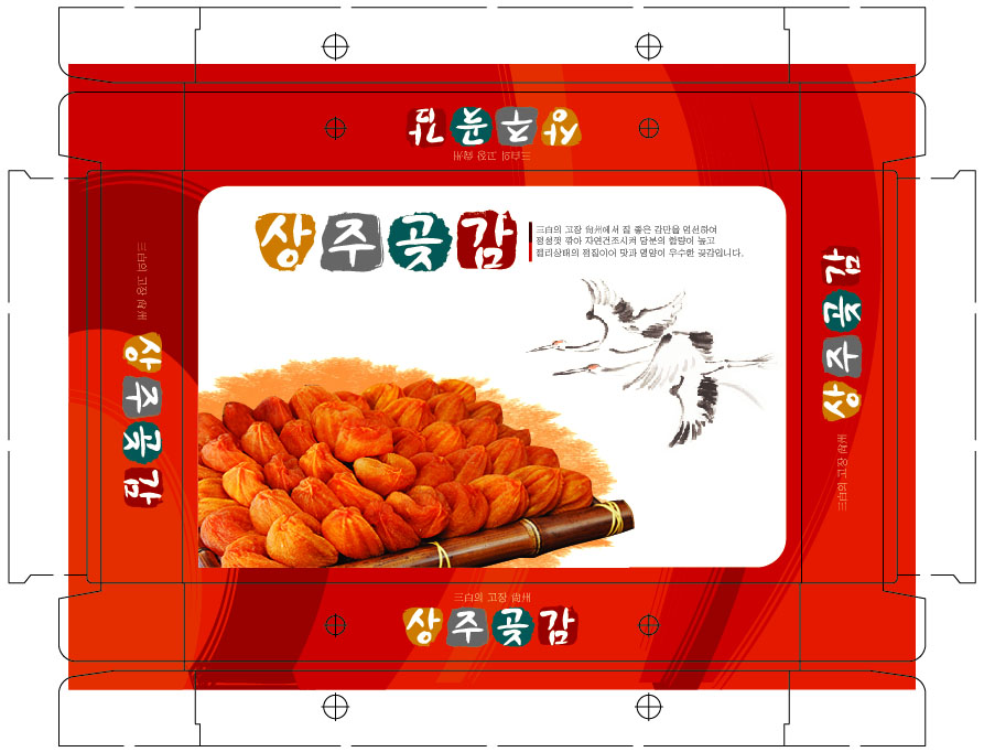 그리고 곶감색을 사용해 곶감과 테두리와의 구분이 잘 안되어 곶감을 죽이고 하얀 배경이 눈에 많이들어오며 위의 타이틀 글자 하나마다 색을 따로 주어 각기 분산되어 보이며 가득 차 있어 여백이 미흡해보입니다. 하얀 배경을 윗분이 말하셨듯이 아미를 까시고 곶감과 대비된는 약한 색으로 곶감을 강조 하시는 것이 좋을 듯 합니다.